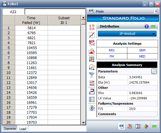 Note: The data sets in this example use units that are not shipped with the software (inches, pounds, and pounds per square inch). If you have the "Manage other repository settings" permission, you could add these units to the database, define their conversion factors and have them available for use for any analysis performed within the database. For the purpose of this example, it is not necessary for the software to able to convert these units to some other units, so we will use the simpler approach of setting up all the units to be in hours.