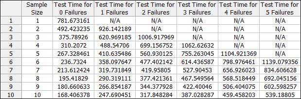 Click the Calculate icon. A table showing a range of test duration values as a function of sample size and number of allowable failures appears, as shown next.