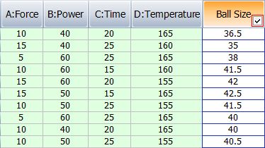 Factor Columns display the settings used for each factor in the run. By default, these columns are titled using the format "X: Factor Name," where X is the abbreviated name. If you have defined the units for the factor, that will also be displayed in the column heading. Factor columns are shown in green by default.