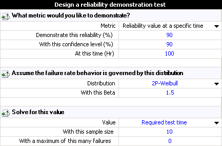 The following example demonstrates how to use the Reliability Demonstration Test (RDT) tool to calculate the test time needed to show a specified reliability at a specified confidence level in a zero-failure demonstration test. A parametric binomial table will also be created which displays a range of test duration values as a function of sample size and number of allowable failures.
